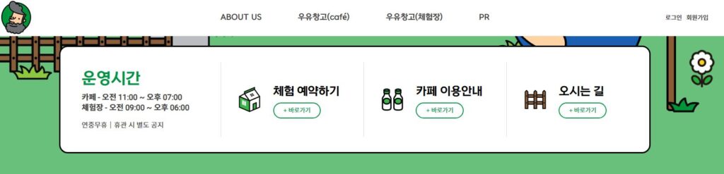 우유창고 견학 체험 했던 곳 주차장 앞에 위치한 공간이에요. 이 공간에서 빈티지한 느낌의 집과 토끼, 염소, 송아지를 만날 수 있었어요. 동물에게 근처의 풀을 주거나 위험한 행동을 하면 안된다는 표지판도 게시되어 있었어요.